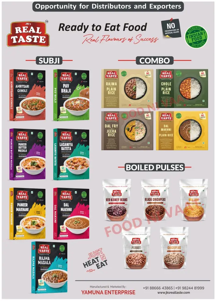 Real Taste is a new-age food brand for the new India who wants to binge on delicious recipes without hassles of cooking while also not compromising on health. Premium and Export Quality Ready to Eat Food Product brand of JKs Real Taste Marketed by Yamuna Enterprise.